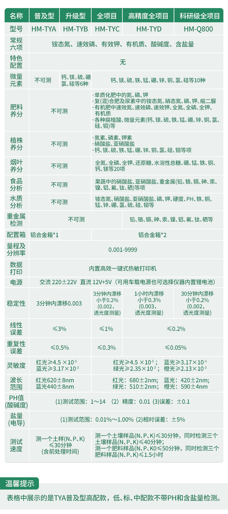 配套齊全:該儀器集藥、器、儀為一體,攜帶方便,相當(dāng)于一個(gè)小型實(shí)驗(yàn)室。適于農(nóng)業(yè)服務(wù)部門或農(nóng)資經(jīng)銷商、肥料廠商測(cè)土施肥和鑒別肥料真假。