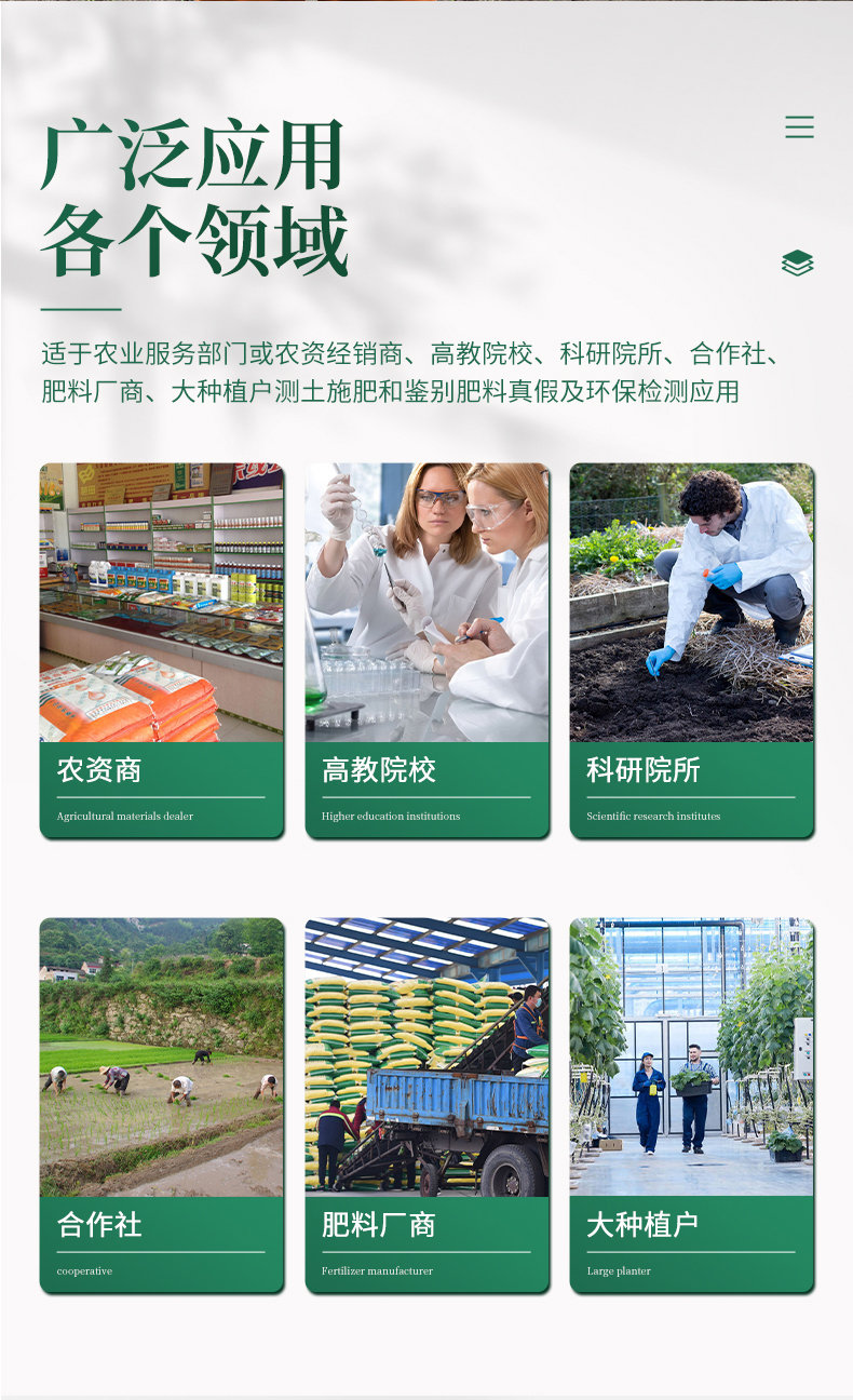 科研級(jí)土壤肥料養(yǎng)分速測(cè)儀功能全:測(cè)試項(xiàng)目國(guó)內(nèi)外全面(各類藥劑均可選購(gòu))。