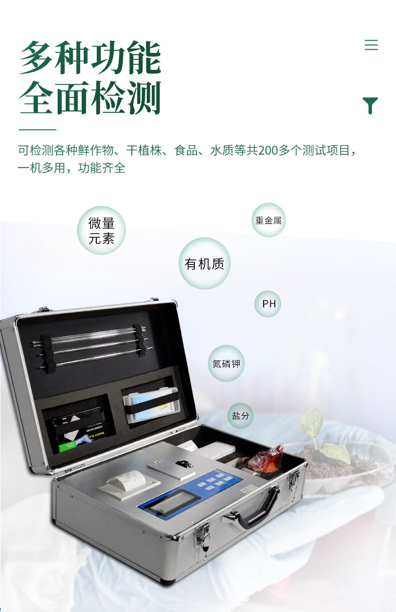 4、全項(xiàng)目土壤肥料養(yǎng)分檢測(cè)儀可檢測(cè)土壤及化肥、有機(jī)肥(含葉面肥、水溶肥、噴施肥等)、植株中的速效氮、速效磷、有效鉀、全氮、全磷、全鉀、有機(jī)質(zhì)、酸堿度,鈣、鎂、硫、鐵、錳、硼、鋅、銅、氯、硅、鉬等各種中微量元素以及鉛、鉻、鎘、汞、砷、鎳、鋁、氟、鈦、硒等各種重金屬含量。
