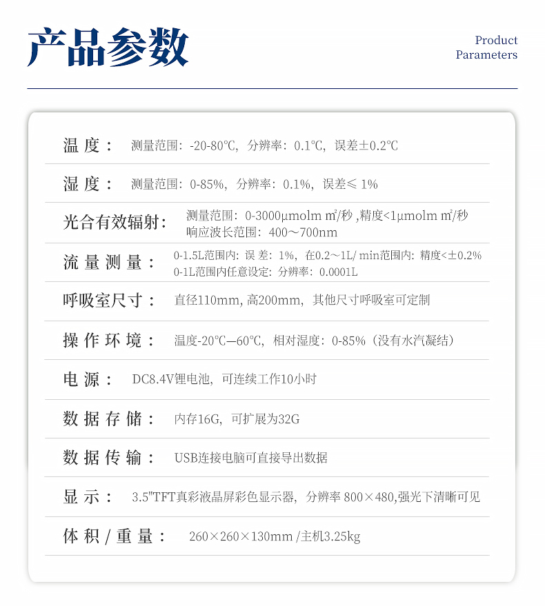 光合有效輻射:帶有修正濾光片的硅光電池,測(cè)量范圍:0-3000μmolm ㎡/秒 ,精度<1μmolm ㎡/秒. 響應(yīng)波長(zhǎng)范圍:400~700nm
