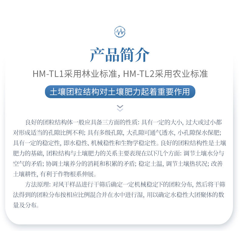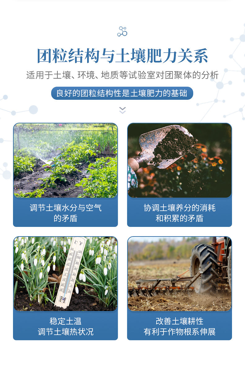 1、土壤團粒結構對土壤肥力起著重要作用。良好的團粒結構體一般應具備三方面的性質:具有一定的大小,過大或過小都對形成適當的孔隙比例不利;具有多級孔隙,大孔隙可通氣透水,小孔隙保水保肥;具有一定的穩(wěn)定性,即水穩(wěn)性、機械穩(wěn)性和生物學穩(wěn)定性。良好的團粒結構性是土壤肥力的基礎,團粒結構與土壤肥力的關系主要表現在以下幾個方面:調節(jié)土壤水分與空氣的矛盾;協調土壤養(yǎng)分的消耗和積累的矛盾;穩(wěn)定土溫,調節(jié)土壤熱狀況;改善土壤耕性,有利于作物根系伸展。土壤團粒分析儀適用于土壤、環(huán)境、地質等試驗室對團聚體的分析。