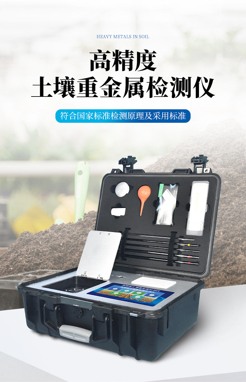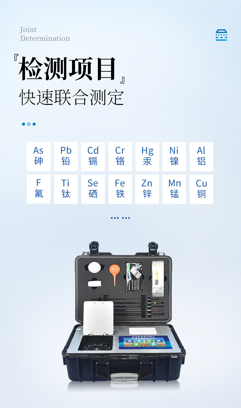 4、土壤重金屬檢測儀集藥,器,儀于一體,相當于一個小型實驗室, 兩個鋁合金箱體,易于攜帶,便于現(xiàn)場測試,流動服務(wù)。適于基層檢測部門對含有重金屬污染的蔬菜、水果等食品進行篩選。