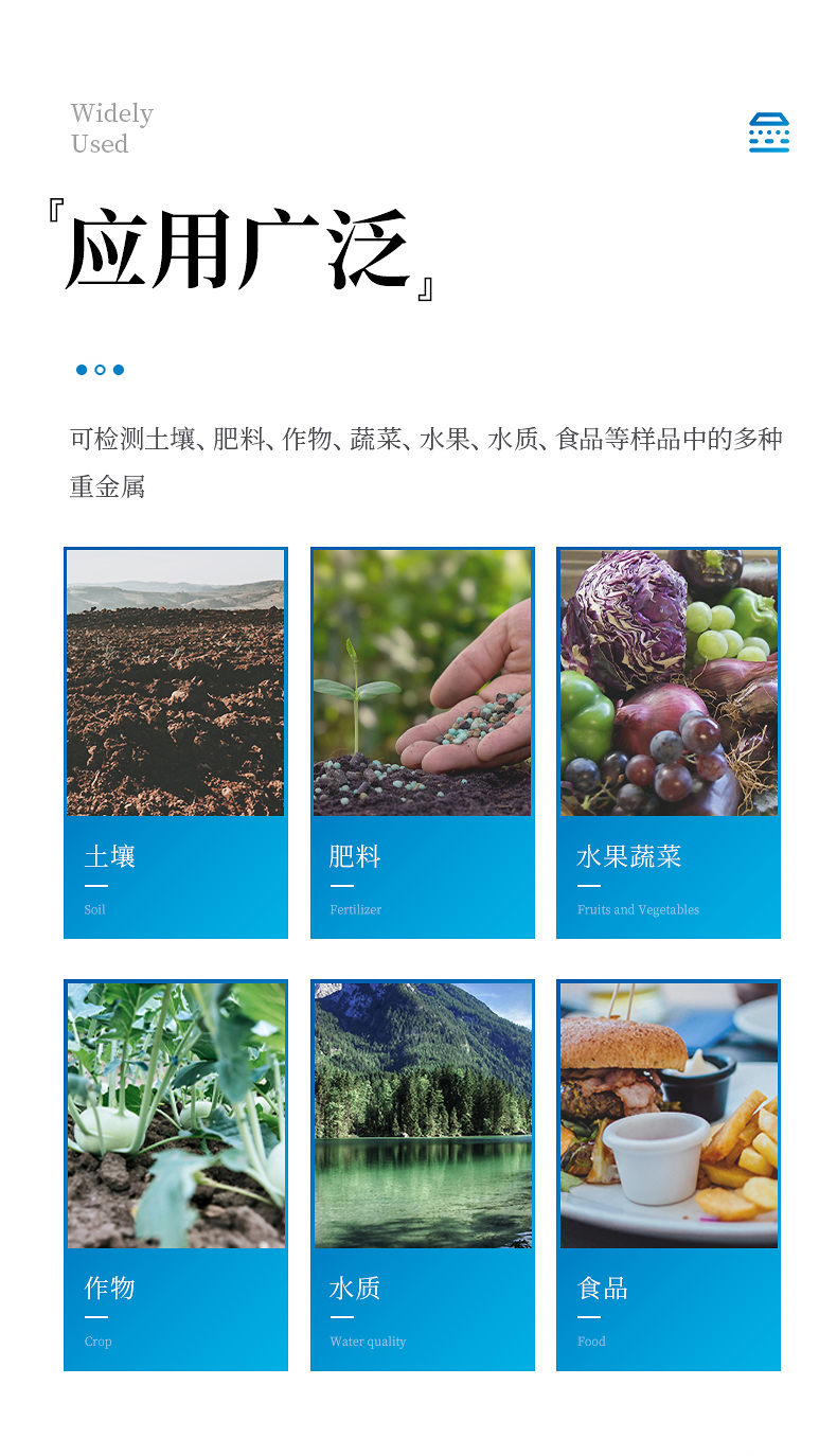 測定土壤、肥料、食品、蔬菜、水果中重金屬(鉛、砷、鉻、鎘、汞、鎳、鋁、氟、鈦、硒、鐵、鋅、錳、銅)。