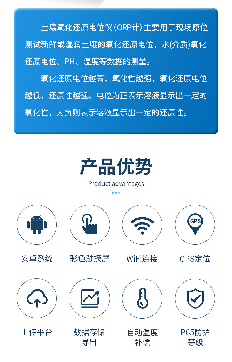 土壤氧化還原電位儀(ORP計(jì))主要用于現(xiàn)場原位測試新鮮或濕潤土壤的氧化還原電位,水(介質(zhì))氧化還原電位、PH、溫度等數(shù)據(jù)的測量。符合《HJ746-2015土壤氧化還原電位的測定電位法》標(biāo)準(zhǔn)。